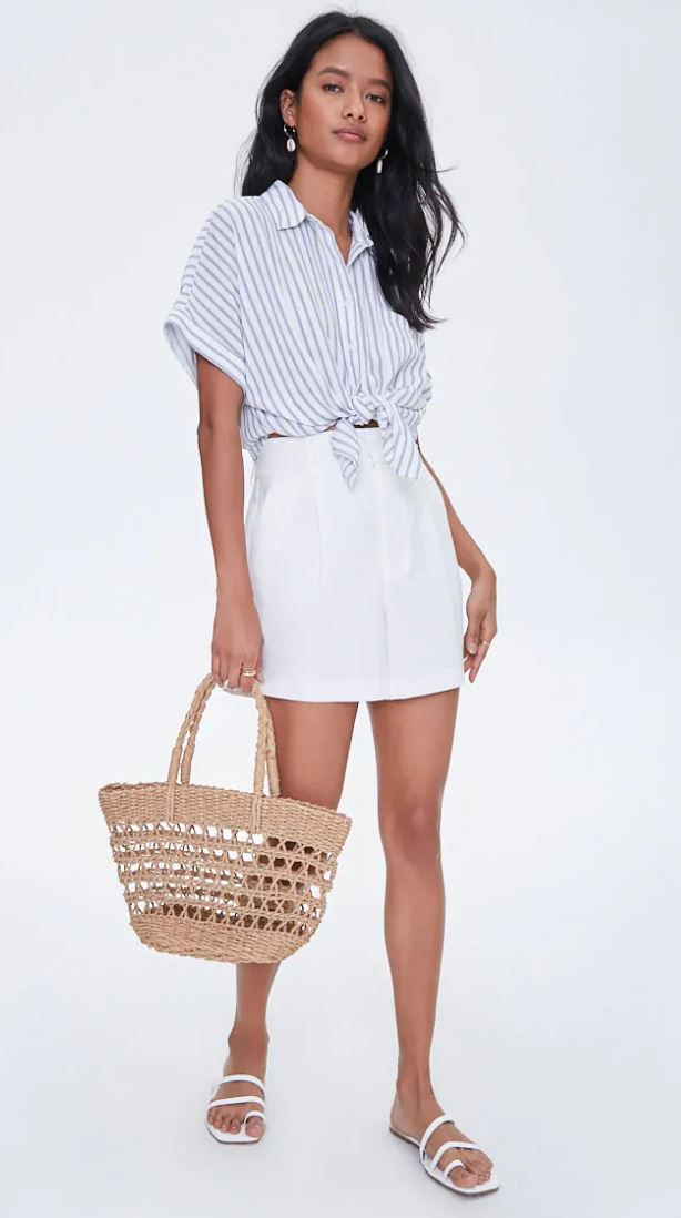 Love the blue and white strips and dolman cut of the shirt, but I do not recommend buying these items from Forever 21 though since the description says made with 100% rayon. My advice is to avoid 100% rayon fabric because it will most likely be wrinkly and will become dingy or shrink horribly after one cycle of machine-washing. But I just adore the timeless look with the white shorts and summery accessories. I applaud the stylists at Forever 21 for putting together such great looks lately!